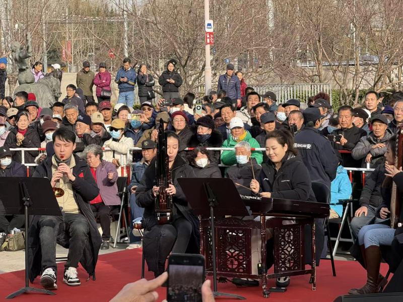 11月29日下午一点半,演出还未开始,天桥市民广场上就人头攒动,挤满了前来观看演出的市民。两点整,演出正式开始。“下面有请我们最会拿捏气氛的民乐团青年演奏家小组为大家带来精彩的表演。”付强、万宇两位相声演员一唱一和,让整台演出的开场充满了欢乐氛围。在热烈的掌声和欢呼声中,中国广播艺术团民族乐团的几位青年演奏家登台,为观众献上了《花好月圆》《步步高》等民乐经典。“站在这个露天舞台上,和观众的距离特别近,能清晰地看到大家的表情和反应,这种亲近感,是平时在音乐厅里很少能体验到的。”中国广播艺术团民族乐团扬琴演奏员徐盈睿在演出后感慨地说。