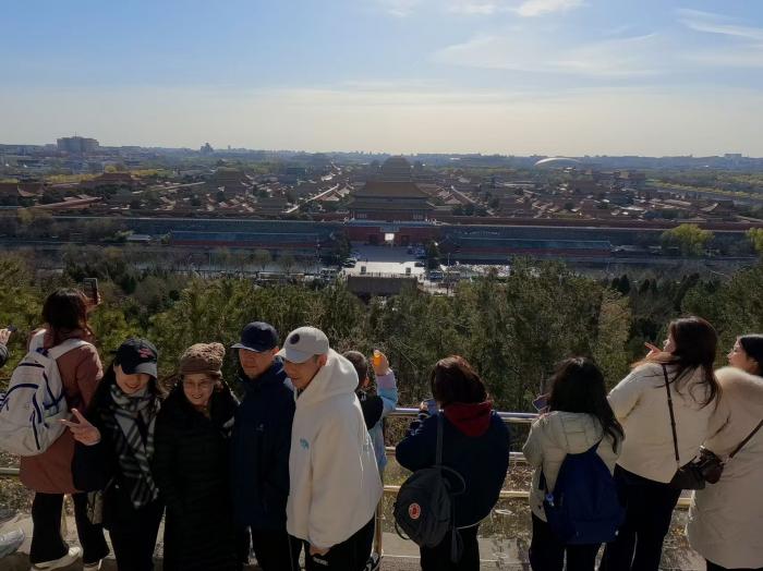 游客驻足远眺,将北海白塔、钟鼓楼乃至西山轮廓尽收眼底。