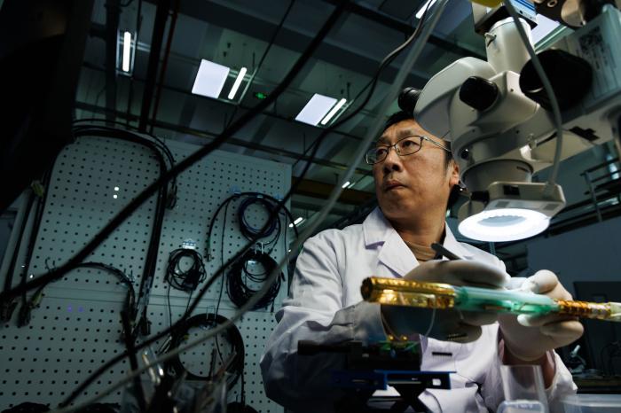 1月26日,在位于北京怀柔的中国科学院物理研究所综合极端条件实验装置极低温强磁场量子振荡实验站,实验站负责人、副研究员李岗在放置实验测量杆。
