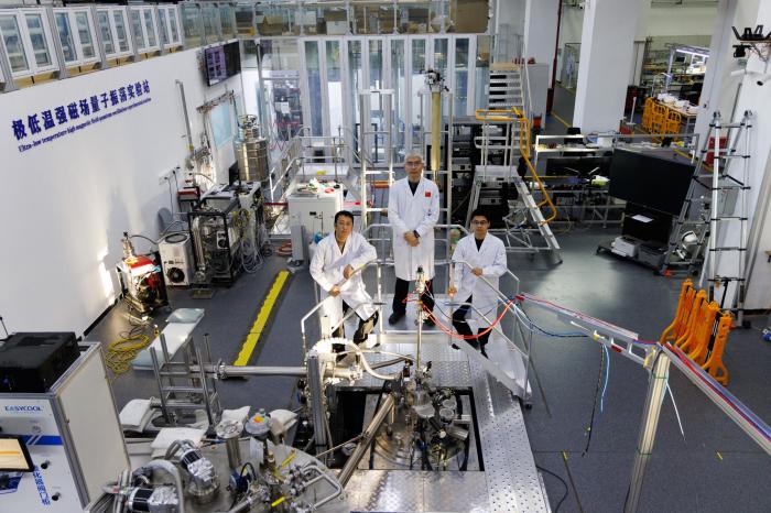1月26日,实验站负责人、副研究员李岗,中国科学院电工研究所研究员刘建华、中国科学院电工研究所博士后周本哲(从左至右)在位于北京怀柔的中国科学院物理研究所综合极端条件实验装置极低温强磁场量子振荡实验站合影。