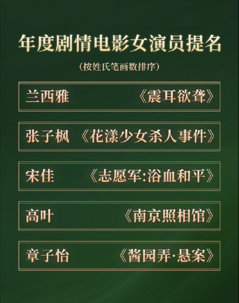 在年度剧情电影女演员提名名单上的是:兰西雅(《震耳欲聋》)张子枫(《花漾少女杀人事件》)宋佳(《志愿军:浴血和平》)高叶(《南京照相馆》)和章子怡(《酱园弄·悬案》)。