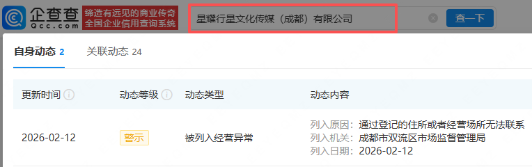 3月27日,企查查APP显示,因通过登记的住所或者经营场所无法联系,星耀行星文化传媒(成都)有限公司被列入经营异常名录。