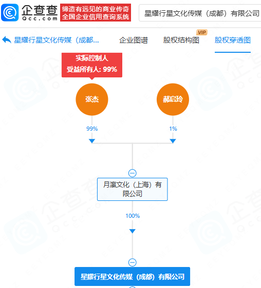 企查查显示,星耀行星文化传媒(成都)有限公司成立于2020年7月,法定代表人为郝启玲,注册资本为300万元,由张杰实际控股的月瀛文化(上海)有限公司全资持股。