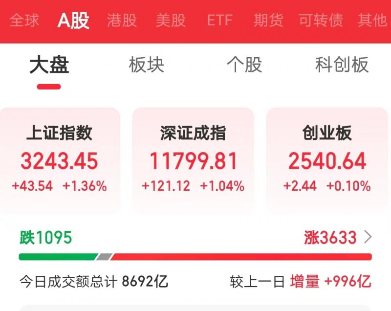 6日,大盘震荡反弹,沪指相对偏强收复3200点。截至收盘,上证指数涨1.36%,报3243.45点。深证成指涨1.04%,报11799.81点。创业板指涨0.10%,报2540.64点。