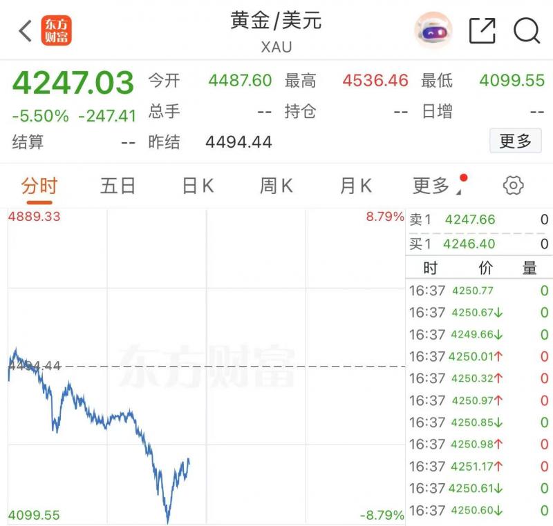 3月23日,现货黄金日内一度跌逾8%,失守4100美元关口,随后跌幅缩小。截至北京青年报记者发稿时,现货黄金报4222.76美元/盎司,跌6.04%。COMEX黄金期货报4250.2美元/盎司,跌7.1%。国际金价已抹去2026年全年涨幅。
