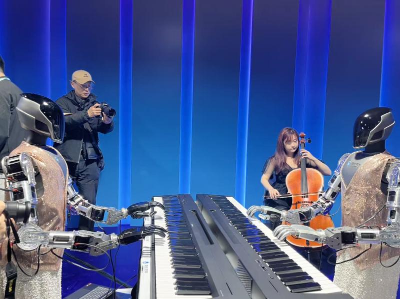 同步亮相的还有茶艺机器人,它可模拟煮茶大师手法,为嘉宾提供便捷、地道的用茶体验。在品茗的同时,参会者还能现场欣赏到机器人乐队与舞蹈机器人联袂献上的精彩表演。北京企业“灵心巧手”的机器人不仅会穿针引线、包饺子,还会弹钢琴,它与北京的另一家机器人企业银河通用合作,共同为现场观众献上才艺。
