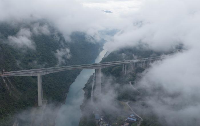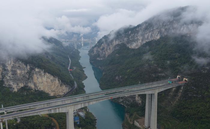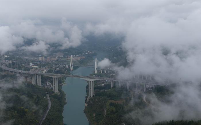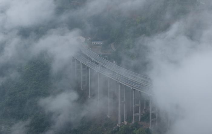 3月26日,重庆市武隆区上空云雾缭绕,宛如仙境(无人机照片)。