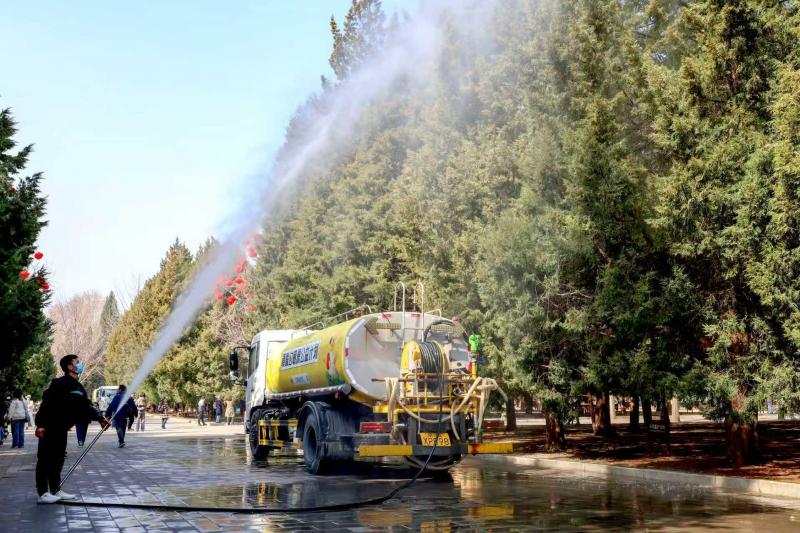 天坛公园也对园内1500余株柏树开展适当修剪,从源头减少花芽生成数量。在游客量较少、花粉浓度较高的时段,组织绿化队与保洁人员对主干道两侧柏树开展高压清水喷淋,及时冲刷花枝和花粉;每日开园前、闭园后,强化地面清扫与湿化作业。同时,充分启用草坪微喷系统提升空气湿度,抑制花粉悬浮扩散。各项作业同步开展游客疏导,播放温馨提示广播,最大程度减少对游园秩序的影响。