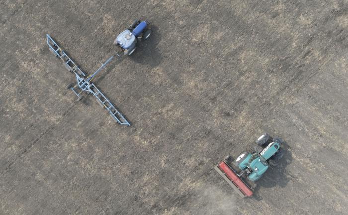3月25日,农机在位于黑龙江省哈尔滨市的北大荒集团闫家岗农场有限公司一处耕地上播种小麦(无人机照片)。