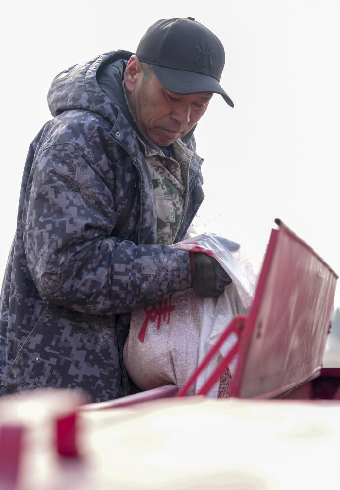 3月25日,农户在位于黑龙江省哈尔滨市的北大荒集团闫家岗农场有限公司一处地块将麦种加入播种机中。