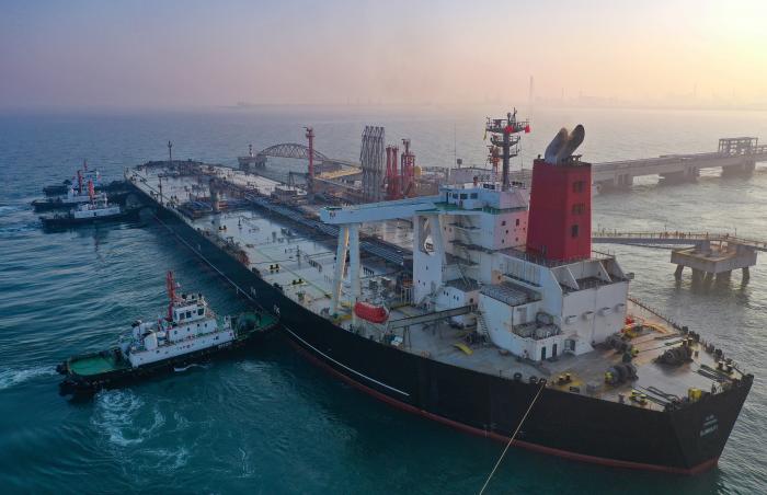 2025年12月18日,一艘装载着17.9万吨石化原辅料的船舶泊入国投洋浦油储码头30万吨级原油泊位(无人机照片)。这是海南自由贸易港正式启动全岛封关后洋浦港口岸第一批通关的“零关税”石化原辅料。新华社记者 郭程 摄