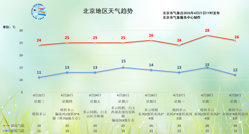 今天(4月21日)北京天气舒适,春和景明好风光,午后偏南风渐起,阵风可达五级左右,预计最高气温在25℃上下,天气还是很适宜大家户外活动的。不过,紫外线辐射较强,外出还请适当防晒,并及时补水保湿润燥。夜间晴空,气温下降迅速,最低气温在10℃左右,昼夜温差大,要适时调整着装,谨防感冒。