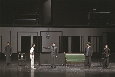 舞台空间设计上,数个简易门框构筑起迷宫式结构,三面围绕着象征周家客厅的核心表演区。客厅上空始终悬挂着由三面深色布景板合围而成的墙体,呼应《雷雨》开篇舞台提示中对周家深褐色的、暗得褪了色的空间设定。而在大部分演出时间里,舞台深处均以白色墙面作为角色上场的背景。直至结尾,所有角色齐聚周家客厅,随着繁漪将周朴园喊来,所有隐秘的人伦关系、矛盾冲突被彻底揭开,这三面深色墙体才正式落下,拦截下所有试图从这座牢笼中逃离的人物与情欲,让观众共同见证这个众人困于其中、以悲剧收场的故事。