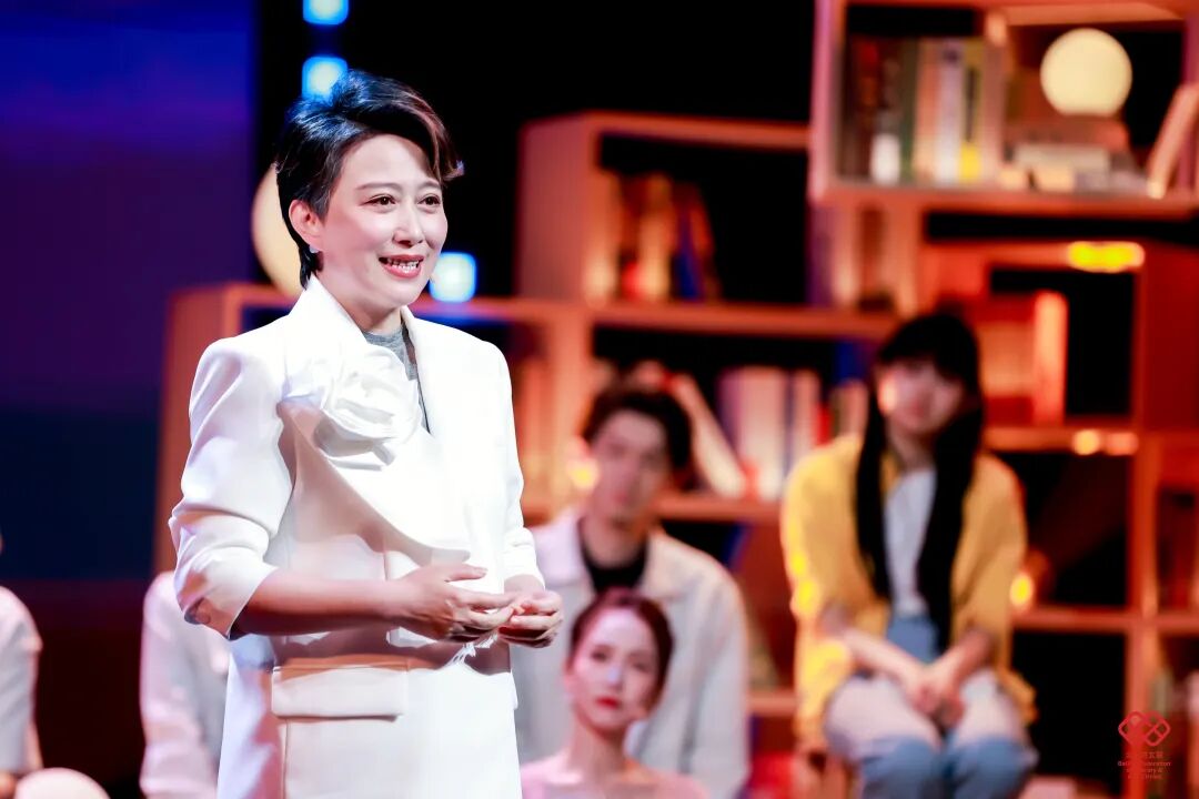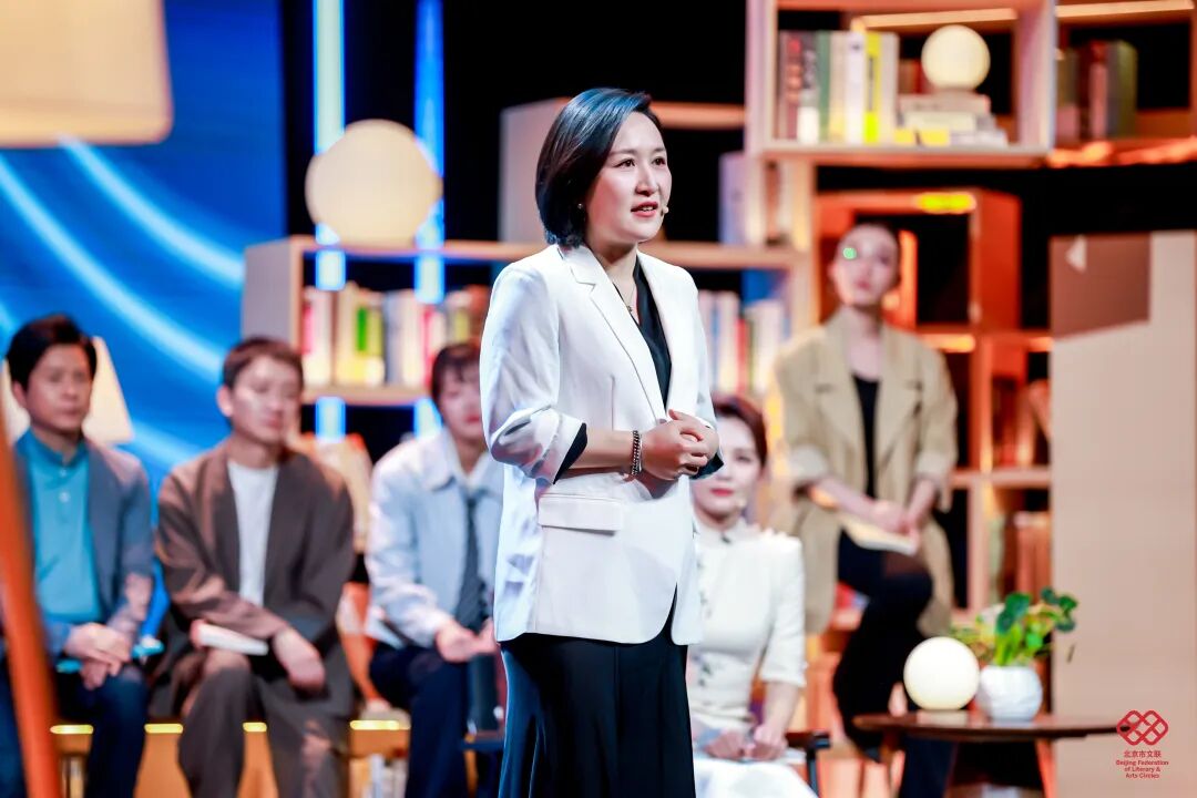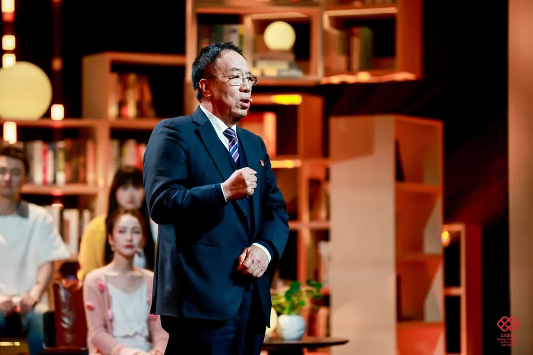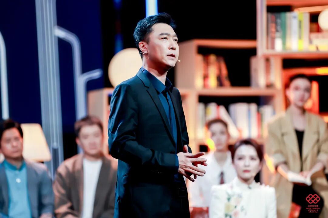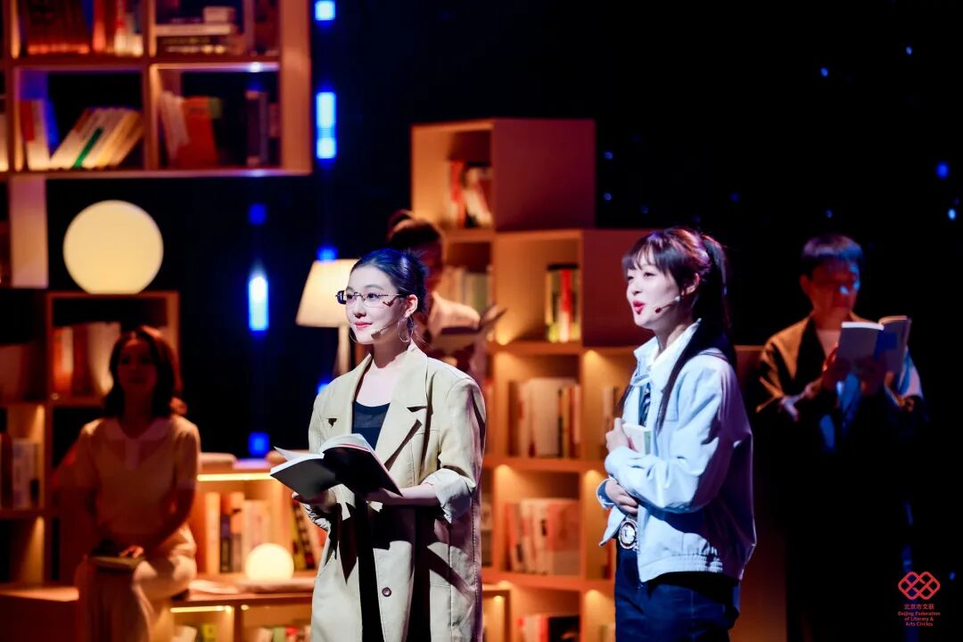 舞台美术以“城市书房”为设计理念,通过悬浮、错落拼接的书架,搭建兼具文学底蕴、叙事功能与场景体验的沉浸式阅读空间;11位讲述者自带鲜明身份标识与北京地域文化符号,形成多元叙事剖面;主持人以现场叙事中枢、主题解读人、时代观察者三重身份定位,以兼具文学性、思辨性与共情力的诗意表达,构建贯穿全场的统一叙事语态;情景戏剧化串场实现文学叙事与舞台艺术的有机融合,强化整体美学质感与艺术张力。