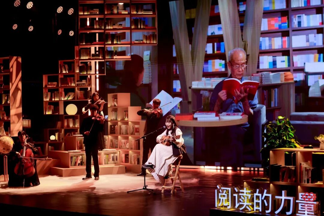 作为篇章隔断的4个文艺节目各具特色,开场节目《阅读的力量》用戏剧演员的情景表演开宗明义,奠定整场活动的基调;特邀中国首位视障播音硕士、青年朗诵家董丽娜充满感情地朗诵作家梁鸿的作品《要有光》段落,柔弱声音中传递坚韧的力量;原创歌曲《人间书语》在民谣歌手唐甜甜与乐队的共同演绎下,自然流露,温暖动人;歌手张赫煊带来全民阅读主题歌曲《一路有你》,在天使童声合唱团的伴唱中,伴随着“跨越书山,我们就是高山,书香弥漫,像彩虹着色人间”的歌声,整场活动圆满落幕。