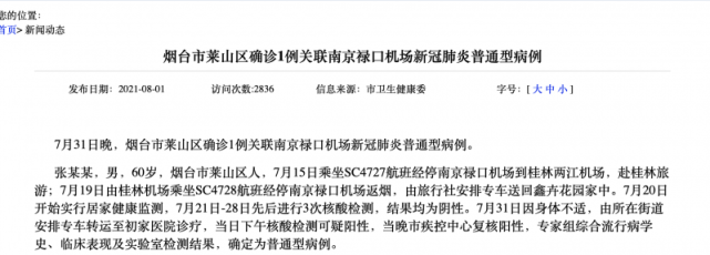 7月31日晚,莱山区确诊1例关联南京禄口机场新冠肺炎普通型病例。