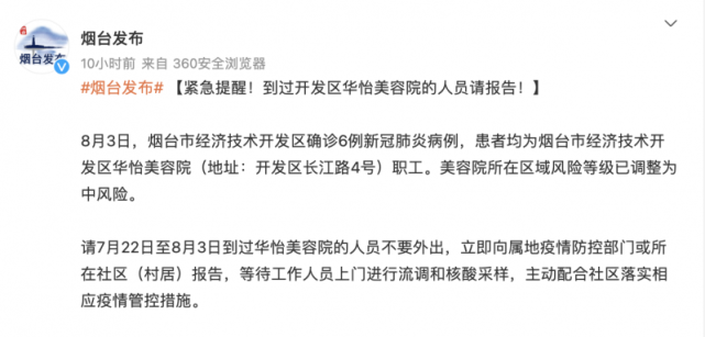 @烟台发布消息称,8月3日,烟台市经济技术开发区确诊6例新冠肺炎病例,患者均为烟台市经济技术开发区华怡美容院(地址:开发区长江路4号)职工。美容院所在区域风险等级已调整为中风险。