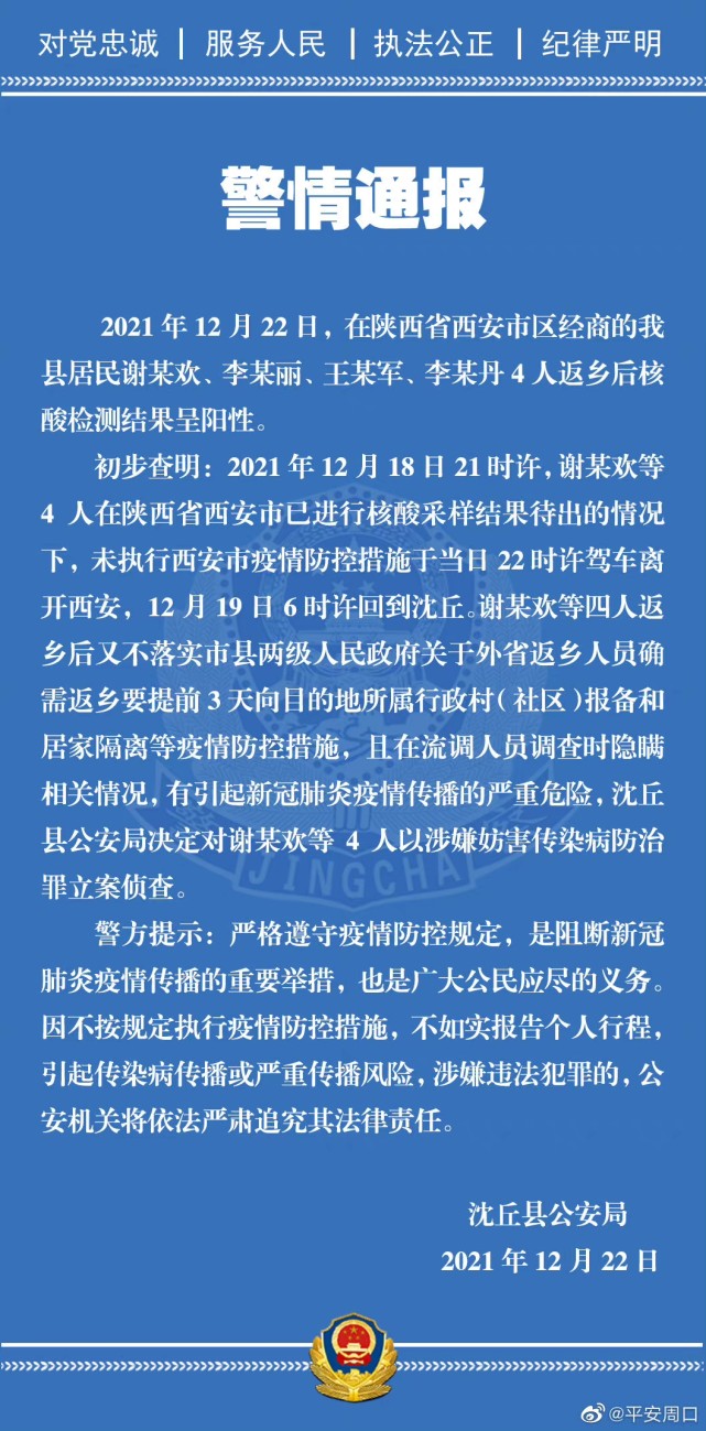 河南省周口市沈丘县公安局22日晚通报称,2021年 12 月 22 日,在陕西省西安市区经商的沈丘县居民谢某欢、李某丽、王某军、李某丹4人返乡后核酸检测结果呈阳性。