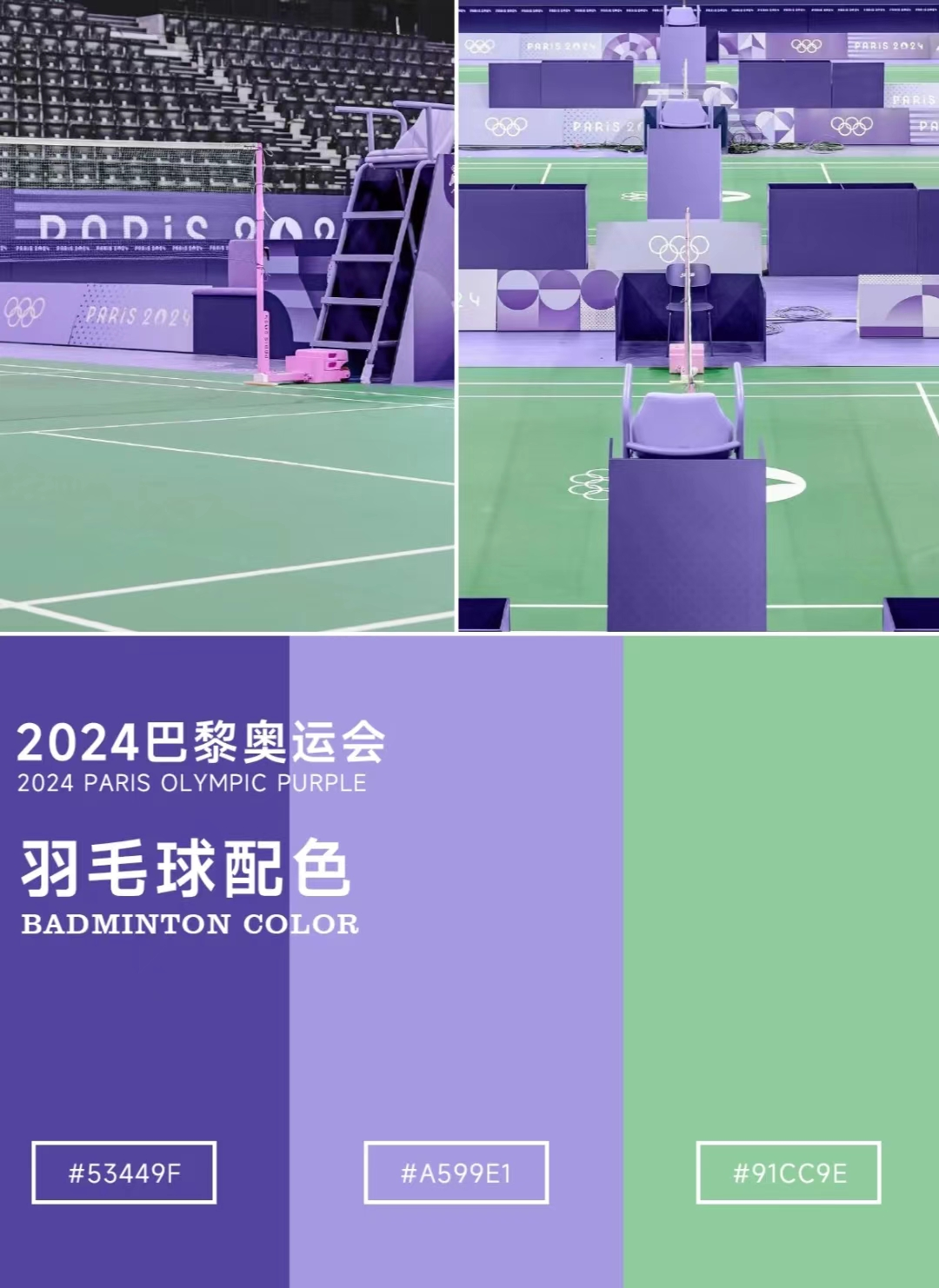 比赛场馆采用三种主色调:蓝色、绿色和紫色,根据每个场馆的主色调,内部的体育器材也带有对应的配色。巴黎奥运会将法式浪漫呈现得淋漓尽致,绿紫配色的羽毛球、蓝粉配色的篮球、蓝灰配色的乒乓球、粉紫配色的橄榄球……球类一个个色彩缤纷,如同梦幻乐园一般,随处可见的奥运紫不仅点缀了赛场,也将大家的观赛热情与期待值拉满。观看巴黎奥运会不仅是对心脏的刺激收缩,也是对视觉审美的冲击征服。
