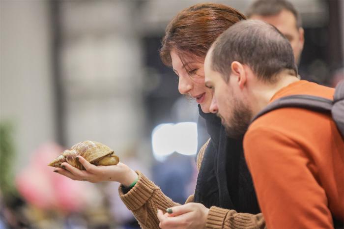 12月14日,在俄罗斯圣彼得堡,参观者在“2025宠物秀”上观察巨型蜗牛。