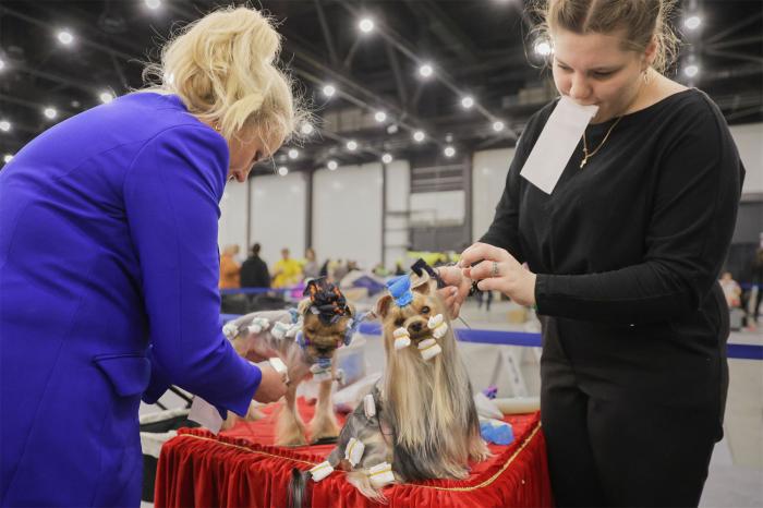12月14日,在俄罗斯圣彼得堡,宠物美容师在“2025宠物秀”上为宠物狗“梳妆打扮”。