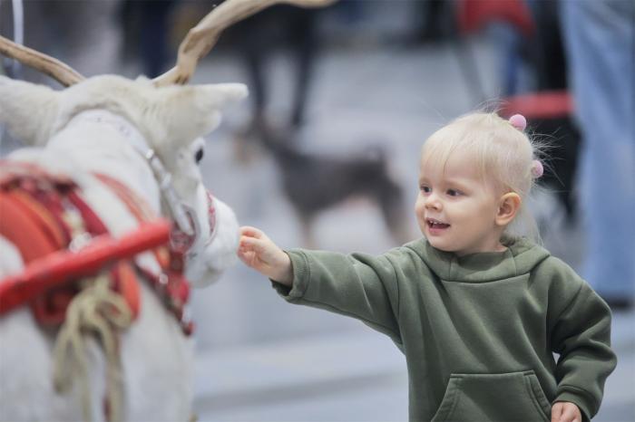 12月14日,在俄罗斯圣彼得堡,一名女孩在“2025宠物秀”上喂鹿。