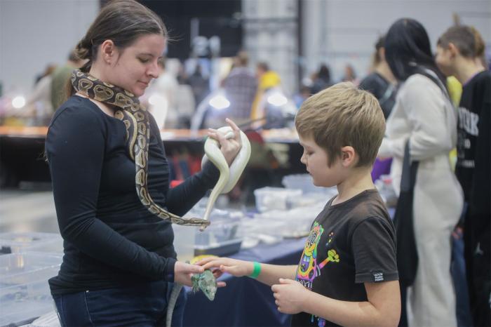 12月14日,在俄罗斯圣彼得堡,一名男孩在“2025宠物秀”上触摸展出的宠物。