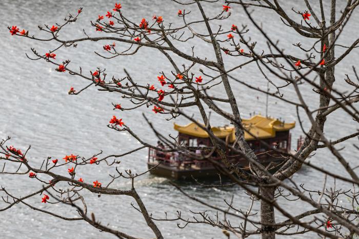 游客在海南昌江乘船游览昌化江,欣赏木棉花春色(2月15日摄)。