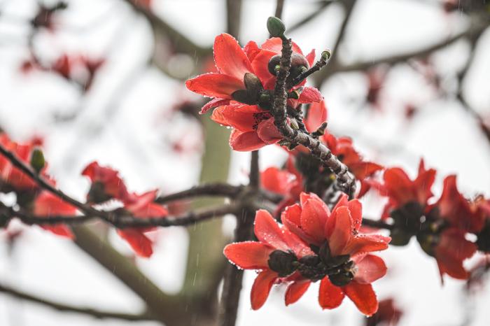 2月17日在海南昌江乌烈镇拍摄的在雨中绽放的木棉花。