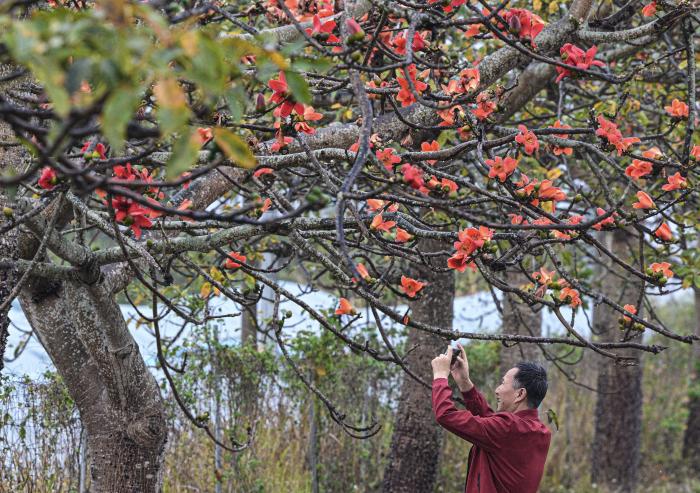 2月17日,游客在海南昌江乌烈镇拍摄木棉花。