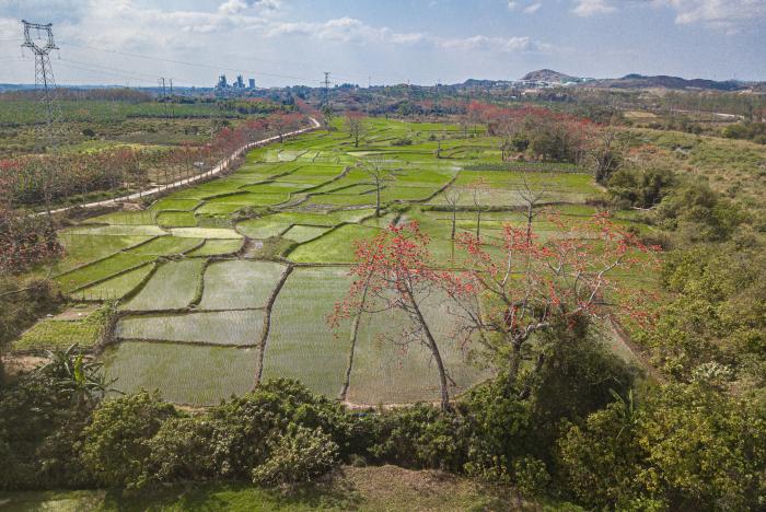 在海南昌江叉河镇拍摄的木棉花与稻田春色(2月14日摄,无人机照片)。