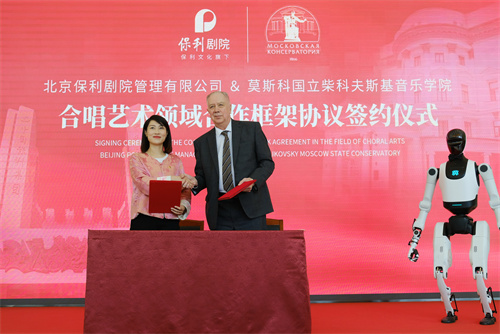 在签约仪式上,保利剧院公司代表与莫斯科国立柴科夫斯基音乐学院校长正式签署《合唱艺术领域合作框架协议》,标志着“保利×柴院”五年合作计划(2026—2030)正式启动。