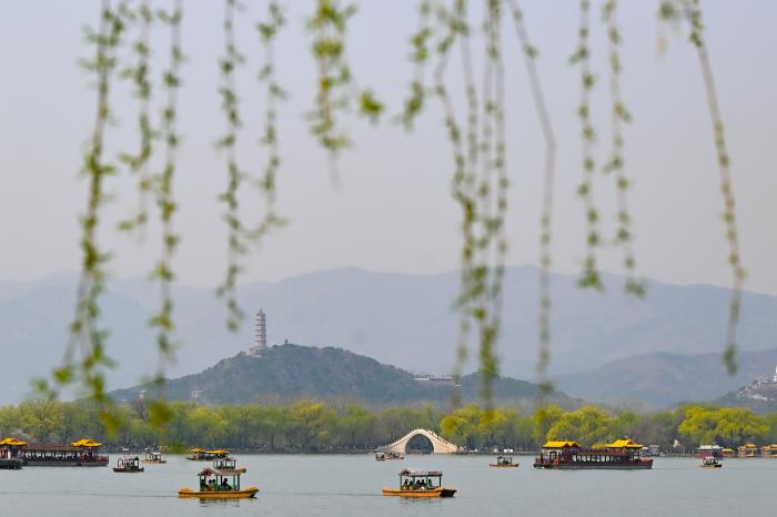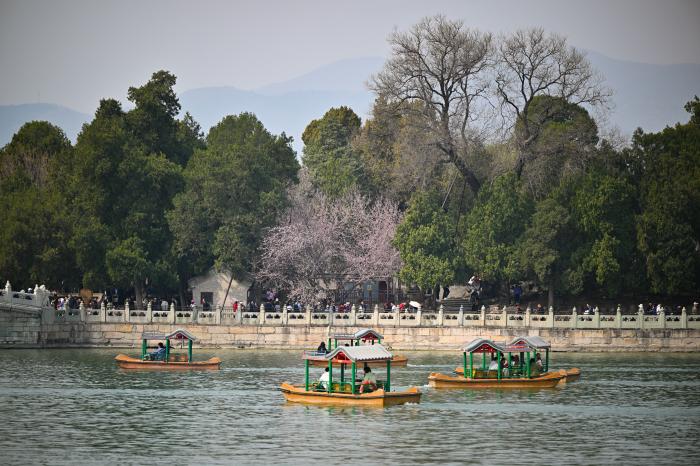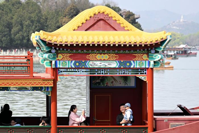 3月27日,人们在北京颐和园游玩赏景。