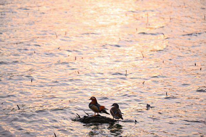 3月27日,一对鸳鸯在北京颐和园内嬉戏。