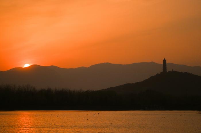 3月27日在北京颐和园拍摄日落时分的玉泉山玉峰塔。