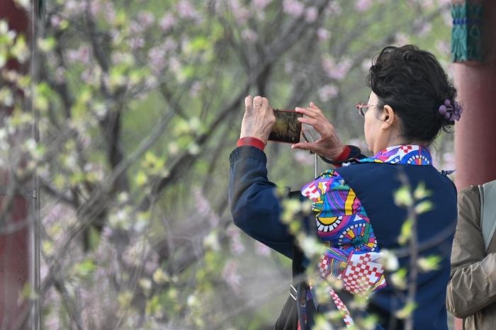 3月27日,一名游客在北京颐和园内轻嗅芬芳。