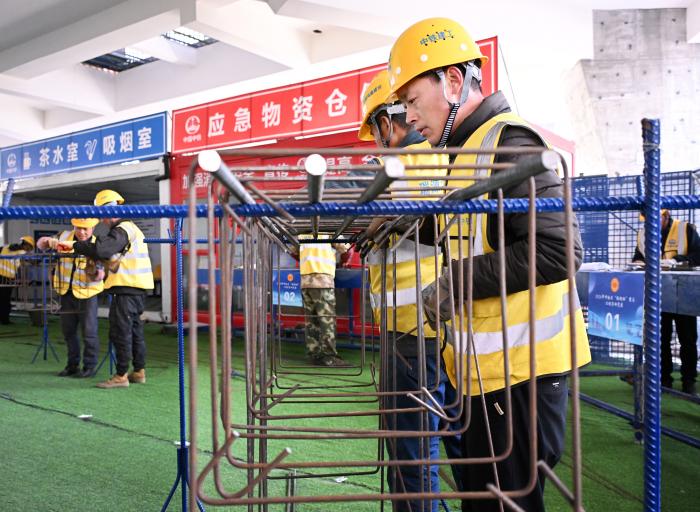 4月8日,在青岛市南京路1号项目比赛现场,选手参加钢筋工团体赛。