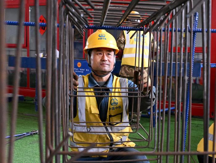 4月8日,在青岛市南京路1号项目比赛现场,一名选手在钢筋工团体赛中。