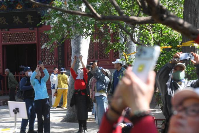 寺内游人络绎不绝,众多游客围聚丁香树下,选取不同角度拍摄繁花,定格春日美好瞬间。
