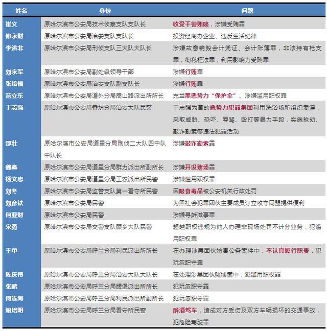 上述19名害群之马均被开除党籍或公职,并移送司法机关。其中有7名为处级干部,10多名为哈尔滨公安局下属分局派出所所长、看守所民警,交警支队民警和治安大队民警。