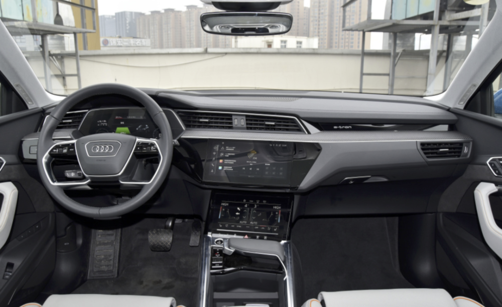 内饰方面,国产e-tron配备12.3英寸液晶仪表,中控区域配备尺寸分别为10.1英寸、8.6英寸的高清触摸屏,科技感十足。四辐式方向盘,兼顾美观与操控。