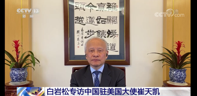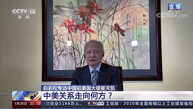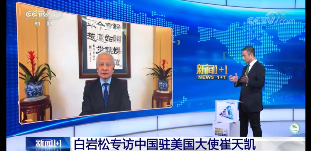 3月26日晚上,驻美大使崔天凯就中美高层战略对话和中美关系未来走向等接受了中央电视台新闻频道《新闻1+1》栏目、央视新闻客户端《白·问》栏目主持人白岩松连线直播专访。