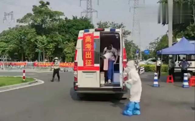6月7日早上,广东佛山一辆车身贴着“满怀希望,所向披靡”“高考出征,金榜题名”标语的救护车在交警铁骑开道带领下,从平洲华福御水岸驶出,8时许,救护车抵达考点门口,三名考生依次下车,在防疫人员的指引下走进考场。