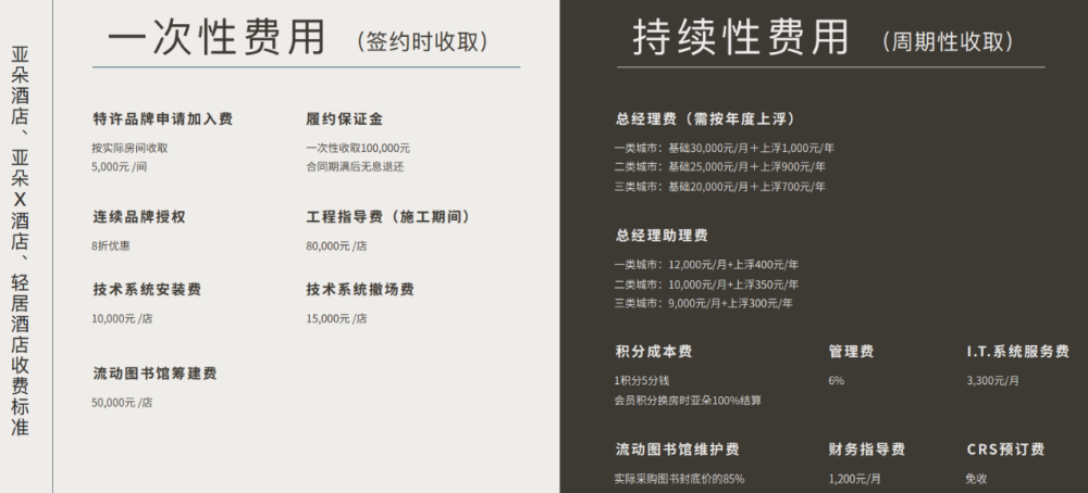 签约时,加盟商需要支付每间客房4000至6000元的预付加盟费。开业后,加盟商还需要每月向亚朵酒店支付店面总收入5%—6%的管理费,以及酒店用品购买费、I.T.财务等持续性指导费。其中,总经理费和总经理助理费按年上浮的细则,是2019年新加入的。