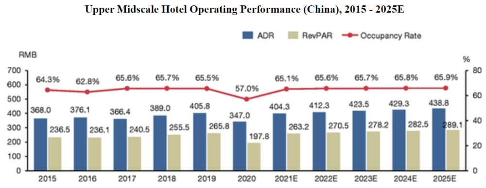 根据分析机构Frost & Sullivan数据,中国2020年中高端酒店入住率、ADR与RevPAR分别为57%、347元、197.8元,亚朵酒店在平均线以上。