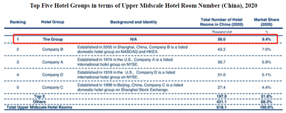 在招股书中,亚朵酒店对自身的定位亦是“中国最大中高端酒店”。其衡量标准为房间数量。根据分析机构Frost & Sullivan的数据,亚朵酒店(剔除高档、中档产品线,比较中高档产品线)在中国中高档酒店集团房间数量的市场占有率最高,为9.4%。其后为华住、速八、希尔顿、首旅。