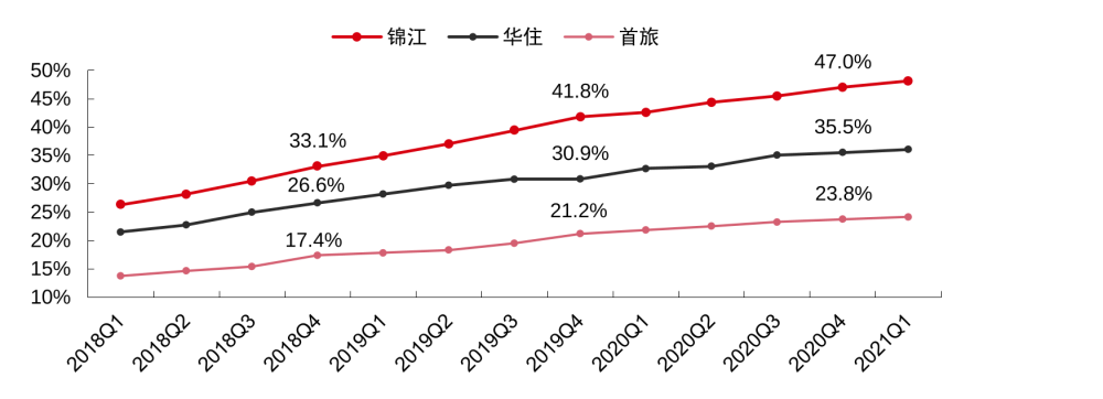 中信证券研报显示,2018第一季度至2021第一季度,锦江酒店、华住集团、首旅如家向中高端酒店方向发展,成果明显。
