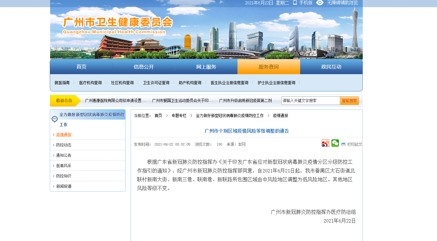 据广州市卫健委官网消息,根据广东省新冠肺炎防控指挥办《关于印发广东省应对新型冠状病毒肺炎疫情分区分级防控工作指引的通知》,经广州市新冠肺炎防控指挥部同意,自2021年6月21日起,广州市番禺区大石街道北联村新南大街、新南三巷、联南巷、新联路所包围区域由中风险地区调整为低风险地区。其他地区风险等级不变。