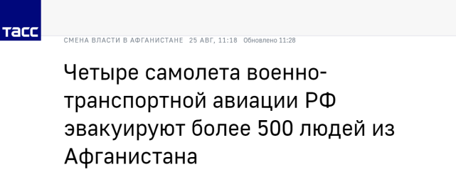 塔斯社称,俄国防部当天发布消息说:“8月25日,俄联邦国防部长谢尔盖·绍伊古将军按照俄联邦总统普京指示,已安排多架军用运输机从阿富汗撤离超过500名俄联邦、集安组织成员国(白俄罗斯、吉尔吉斯斯坦、塔吉克斯坦、乌兹别克斯坦)和乌克兰的公民。”