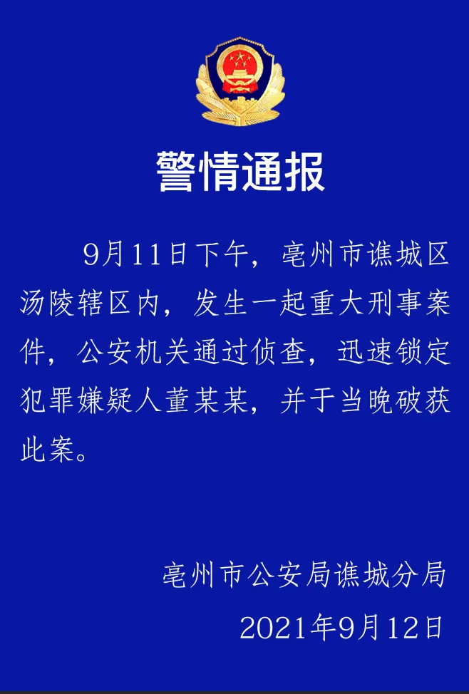 安徽亳州发生一起重大刑事案件,警方通报:已破获